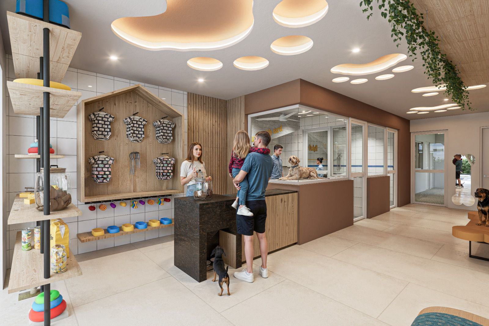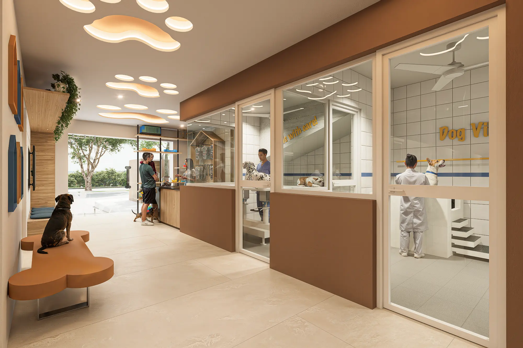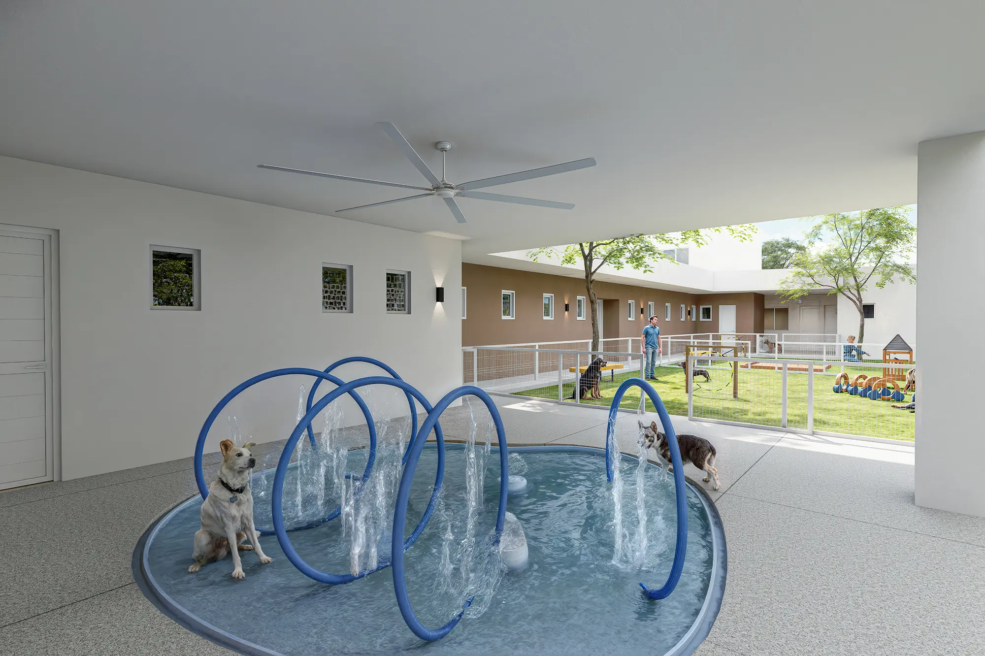 Purpose-designed play spaces that allow dogs to move, explore, and socialize under supervision, balancing energy release with calm interaction.