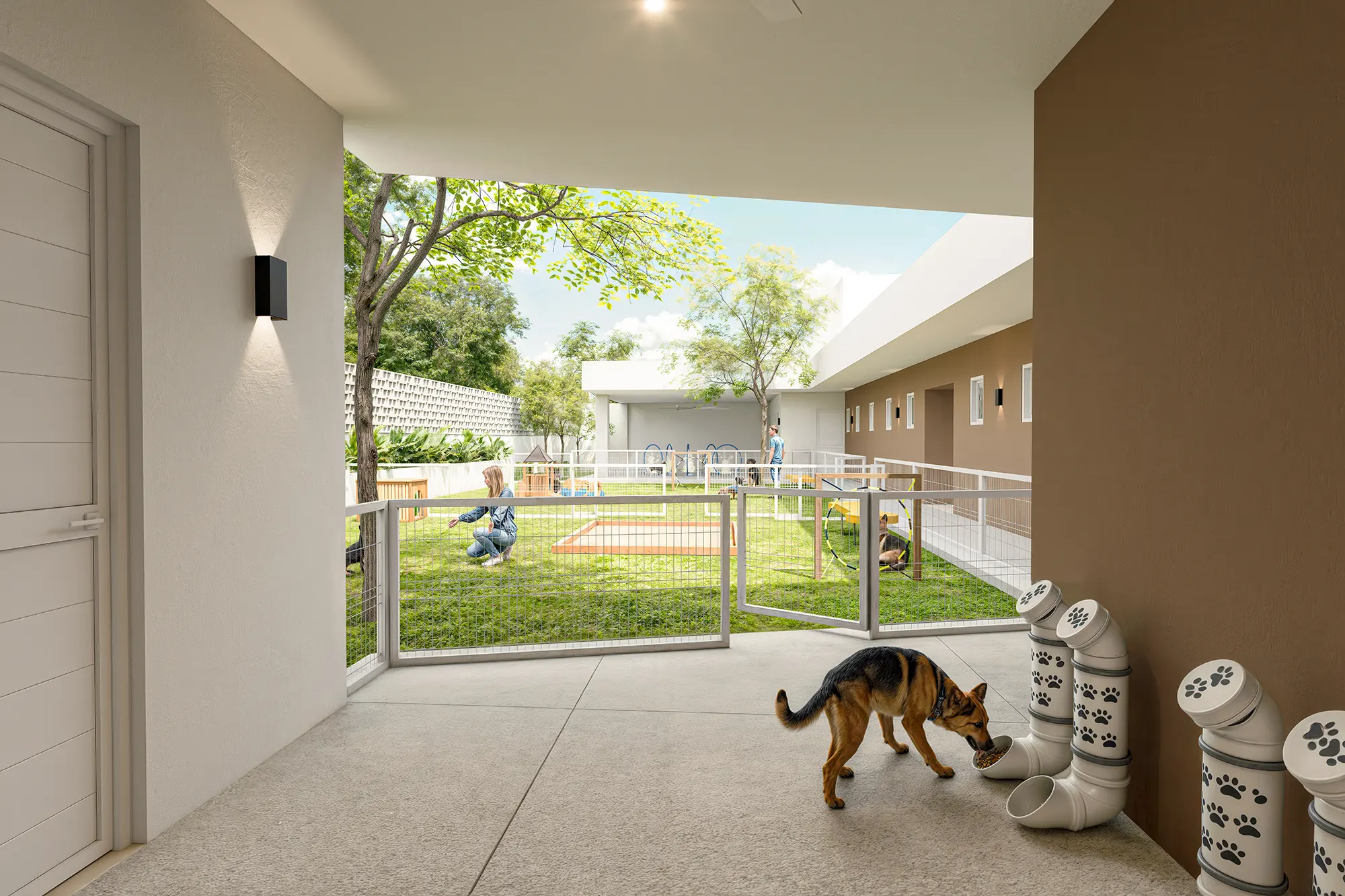 Spacious and secure green areas where dogs can play, run, and socialize freely.